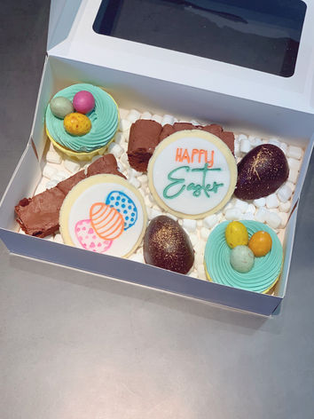 Our treat boxes are a specially crafted gift to tell someone you're thinking of them. As well as the seasonal treat boxes such as the Valentine or Mother's Day boxes we also do personalised boxes which are perfect for an engagement gift, hen do or baby shower. Each box contains a variety of sweet treats, including chocolates filled with edible cookie dough and of course some cupcakes.